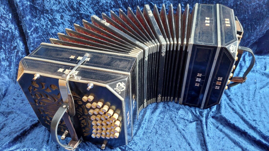 Alfred Arnold ‚America‘ Bandoneon 142 tönig, ½ – Dekor, schwarz (tres estrellas), originale Schelllack-Politur mit schöner, dem Alter entsprechenden Patina, AA-Produktionsnummer #33130, gebaut 1929 in Carlsfeld, das Bandoneon hat originale Zink-Stimmplatten mit Stimmzungen in sehr gutem Zustand, es ist wechseltönig mit Oktavstimmung, a‘ = 442 Hz, rheinisches (argentinisches) System, originaler Balg mit schönem rot marmoriertem Papier, neue moderne Leder-Ventile im Bass und Plastik-Ventile im Diskant (bessere Ansprache), die Mechanik wurde überholt und ist in sehr gutem Zustand, der Klang ist sehr schön und kräftig, es hat Originalknöpfe in sehr gutem Zustand, insgesamt ist es ein sehr gut erhaltenes und klingendes AA ‚America‘ Bandoneon, hergestellt für den Importeur ‚Casa America‘ in Buenos Aires, es kommt mit einer neuen Tasche mit Rucksack-Funktion und einer DVD mit vielen Noten und Lehrwerken für das Bandoneon.