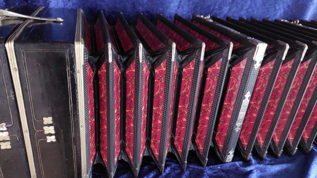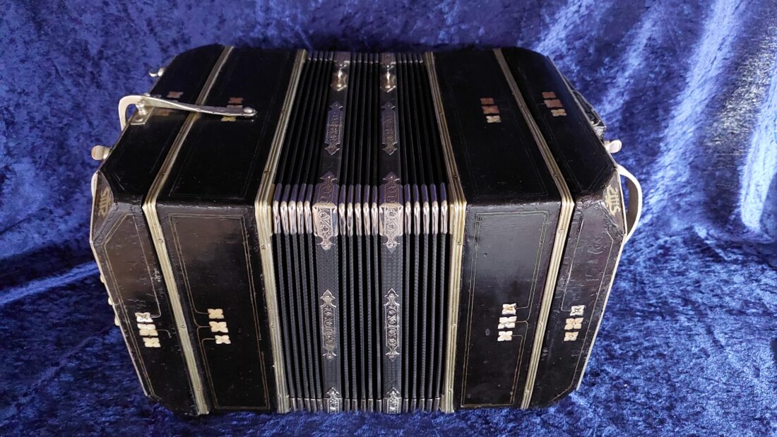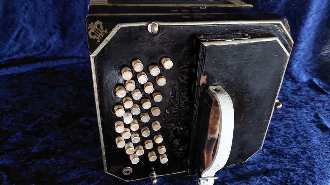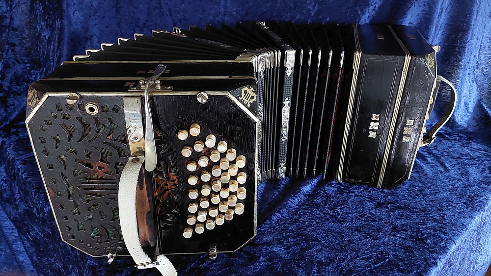 Alfred Arnold Bandoneon 142 tönig, ½ Dekor (tres estrellas), schwarz, AA-Produktionsnummer #2914, gebaut ca.1913 in Carlsfeld, das Bandoneon hat originale Zink-Stimmplatten mit Stimmzungen in sehr gutem Zustand, es ist wechseltönig mit Oktavstimmung, gestimmt auf a‘ = 440 Hz, rheinisches (argentinisches) System, der Balg ist relativ neu (ca.10 Jahre) mit schönem rot marmoriertem Papier (ähnlich dem originalen Gustav-Marmor), originale Leder-Ventile, die Mechanik ist sehr unkonventionell repariert aber funktioniert gut, der Klang ist unglaublich kräftig (eines der kräftigsten Bandoneons, die ich bis jetzt gehört habe) es wird sich in jedem Orchester oder zur Straßenmusik durchsetzen, einfach exzellent, es hat sehr gut erhaltene Originalknöpfe, optisch ist es in keinem guten Zustand sowohl äußerlich als auch im Inneren, da wurde viel gebastelt und überlackiert, es hat also durchaus Restaurationsbedarf, ist aber im jetzigen Zustand absolut spielbar, wer es perfekt haben möchte muss da nochmal Geld reinstecken, wer gerade dafür kein Geld hat, kann mit Freude darauf spielen. Der Verkäufer ist Raucher und das riecht man noch, es wird sich mit der Zeit ändern. Das Bandoneon hat Mikrofone verbaut, da es viel für Straßenmusik und in einer Unterhaltungsband mit Schlagzeug gespielt wurde. Insgesamt ist es ein unglaubliches sehr altes AA Bandoneon mit einem erstaunlichen Klang, dass sehr viel und professionell gespielt wurde, auf jeden Fall ein besonderes Instrument, es kommt ohne Tasche (eine neue Tasche ist gegen Aufpreis möglich), mit einem alten Koffer sowie wie immer mit vielen Noten und Lehrwerken für das Bandoneon.