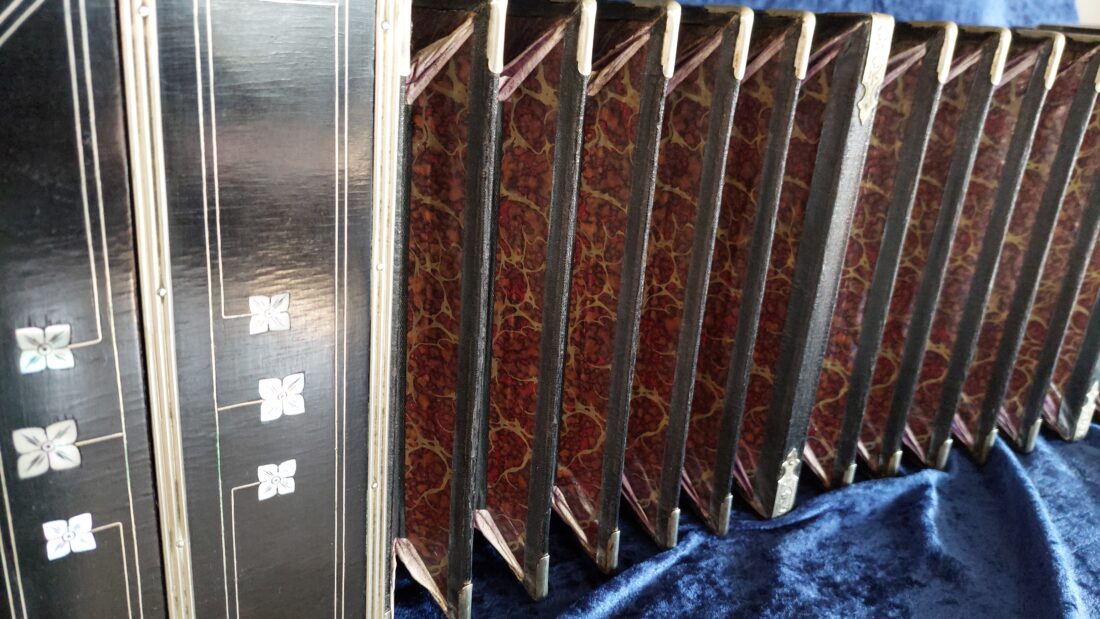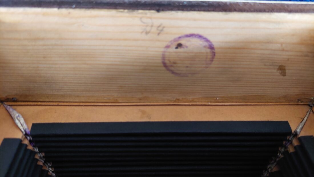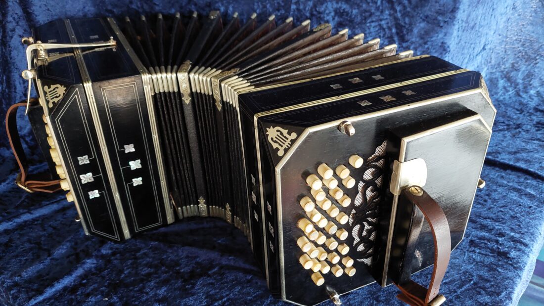 Alfred Arnold Bandoneon 142 tönig, ½ Dekor (tres estrellas), schwarz ( Schelllack-Politur, original), AA-Produktionsnummer #4, gebaut 1911 in Carlsfeld, das Bandoneon hat originale Zink-Stimmplatten mit Stimmzungen in sehr gutem Zustand, es ist wechseltönig mit Oktavstimmung, gestimmt auf a‘ = 442 Hz, rheinisches (argentinisches) System, sehr gut erhaltener originaler Balg mit schönem rot marmoriertem Papier (Gustav-Marmor), neue moderne Leder-Ventile, die Mechanik ist in sehr gutem restaurierten Zustand, der Klang ist exzellent und warm, es hat sehr gut erhaltene Originalknöpfe, insgesamt ist es ein sehr gut erhaltenes und klingendes AA Bandoneon, dass aufgrund seines Alters (das vierte von Alfred Arnold gebaute AA Bandoneon) und seines Erhaltungs- und Restaurationszustandes eine Rarität ist, ohne Tasche (eine neue Tasche ist gegen Aufpreis möglich), mit vielen Noten und Lehrwerken für das Bandoneon.
