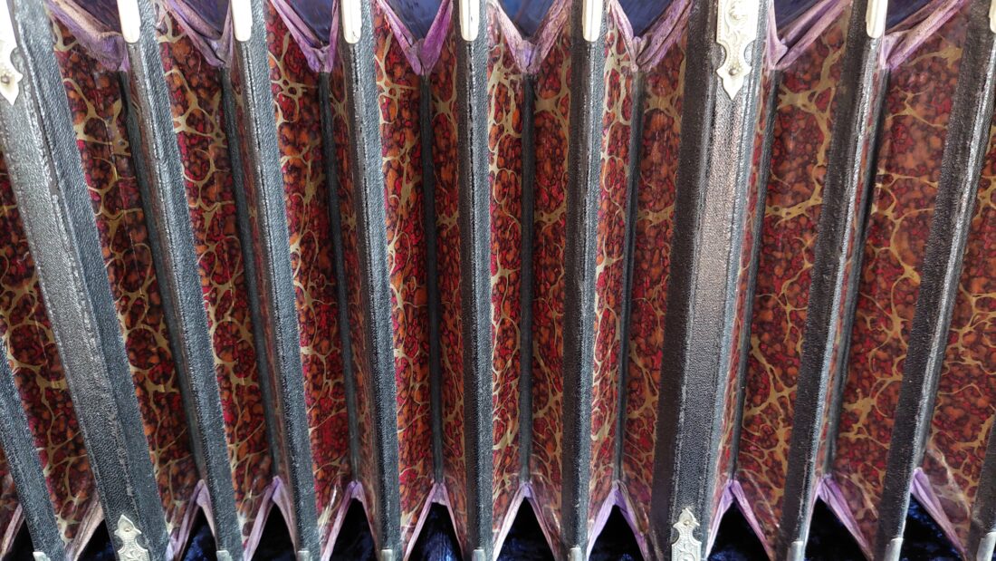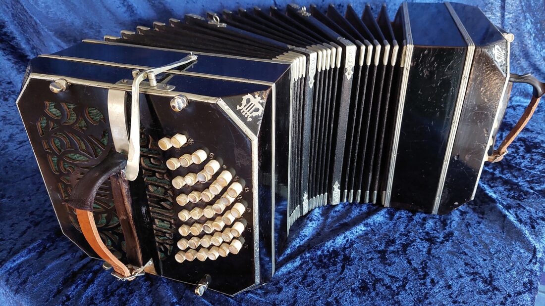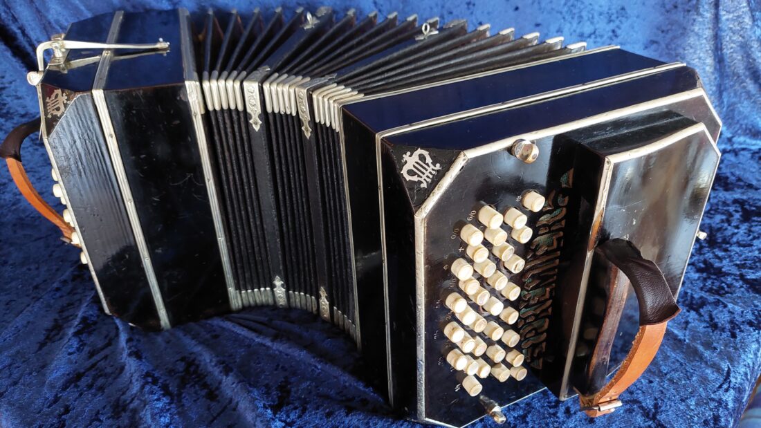 Alfred Arnold ‚Premier‘ Bandoneon 142 tönig, schwarz ( Schelllack-Politur, original), AA-Produktionsnummer #28427, gebaut 1928 in Carlsfeld, das Bandoneon hat originale Zink-Stimmplatten mit Stimmzungen in sehr gutem Zustand, es ist wechseltönig mit Oktavstimmung, in 2022 gestimmt auf a‘ = 443 Hz, rheinisches (argentinisches) System, sehr gut erhaltener originaler Balg mit schönem rot marmoriertem Papier (Gustav-Marmor), neue moderne Leder-Ventile, die Mechanik ist in sehr gutem Zustand, der Klang ist exzellent und kräftig, es hat sehr gut erhaltene Originalknöpfe, insgesamt ist es ein sehr gut erhaltenes und klingendes AA ‚Premier‘ Bandoneon, es kommt mit einem guten gebrauchten Koffer (neue Tasche gegen Aufpreis möglich) und mit vielen Noten und Lehrwerken für das Bandoneon.
