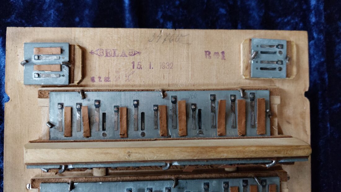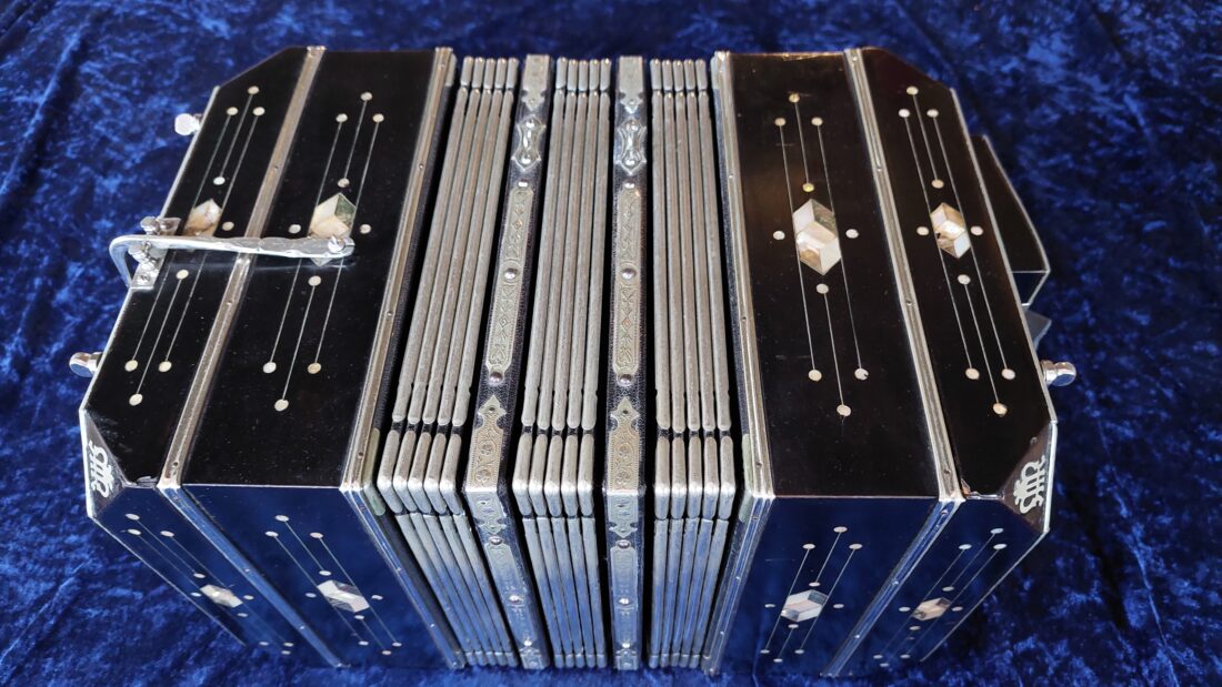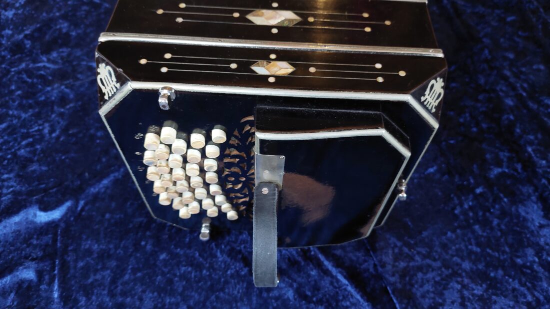 ELA (Ernst Louis Arnold) ‚Germania‘ Bandoneon, 142 tönig, wechseltönig, argentinisches System (rheinisch), schwarz, Jugendstil-Perlmutt-Dekor (Art-Deco), Zink Stimmplatten (Dix), ELA Produktionsnummer #34760, Baujahr-Stempel 1932, originaler Balg mit sehr schönem blauen Alu-Papier, sehr gute originale Knöpfe mit Perlmutt-Einlagen, 2025 gestimmt auf a‘ = 442 Hz und restauriert , gut anliegende Leder-Ventile, Reimport aus Argentinien, mit neuer Tragetasche mit Rucksack-Funktion. Dieses Bandoneon hat einen wunderschönen sonoren, kräftigen Klang. Dazu gibt es wie immer eine DVD mit vielen Noten und Lehrwerken für Bandoneon.