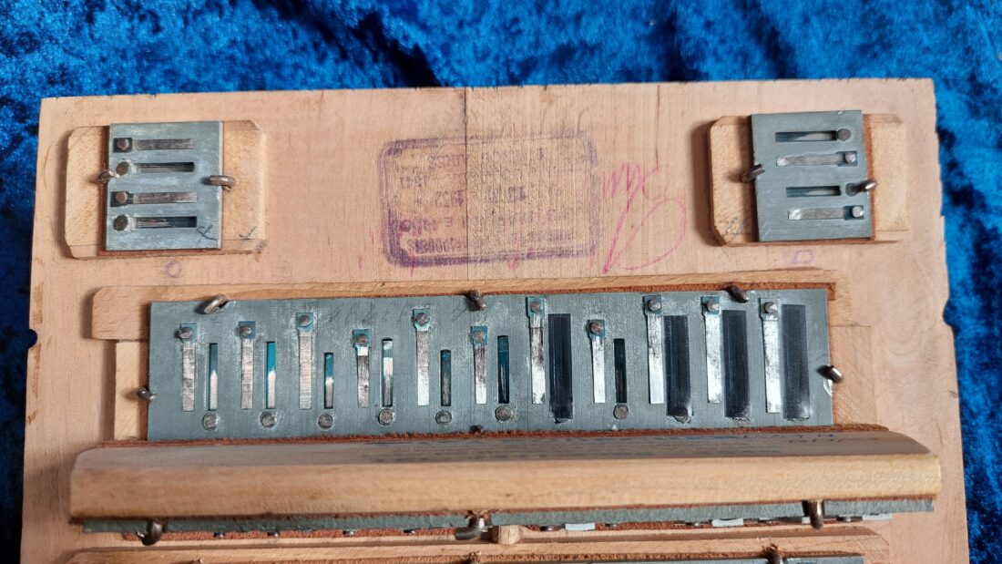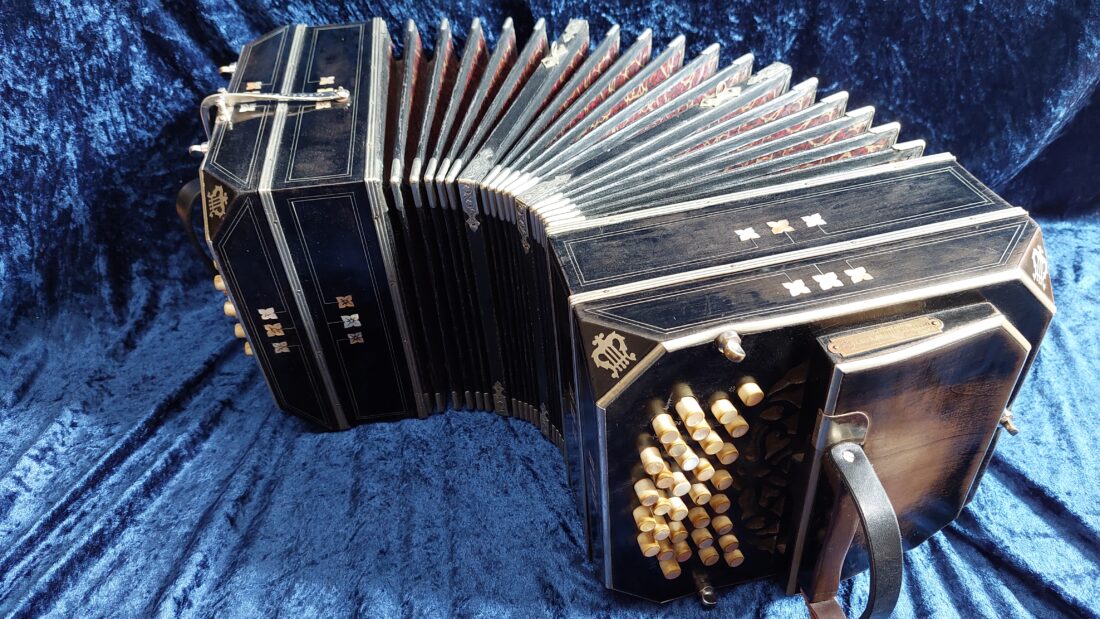 Alfred Arnold ‘America’ bandoneon, 142 notes, ½ – decoration, black (tres estrellas), original shellac polish with beautiful patina appropriate for its age, AA production number #33130, built in 1929 in Carlsfeld, the bandoneon has original zinc reed-plates with reeds in very good condition, it is bisonoric (alternating tone) with octave tuning, a’ = 442 Hz, Rhenish (Argentine) system, original bellows with beautiful red marbled paper, new modern leather valves in the bass and plastic valves in the treble (better response), the mechanism has been overhauled and is in very good condition, the sound is very beautiful and powerful, it has original buttons in very good condition, overall it is a very well-preserved and sounding AA ‘America’ bandoneon, manufactured for the importer ‘Casa America’ in Buenos Aires, it comes with a new bag with backpack function and a DVD with lots of sheet music and teaching materials for the bandoneon.